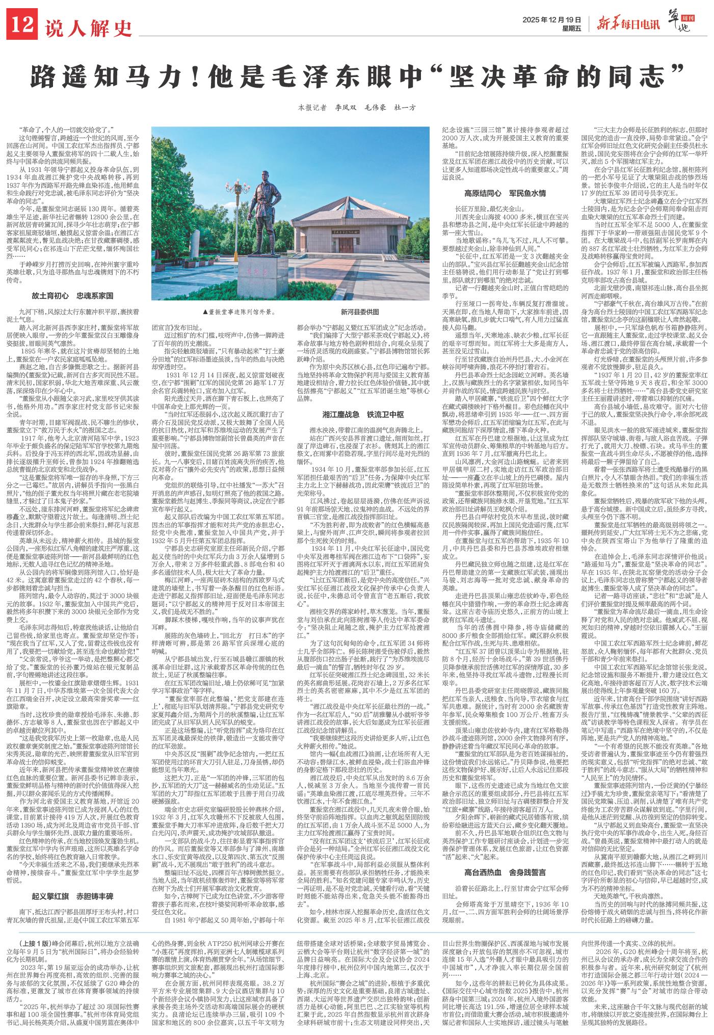 今年,是董振堂同志诞辰130周年。循着英雄生平足迹,新华社记者辗转12800余公里,在新河故居青砖黛瓦间,探寻少年壮志萌芽;在宁都客家祖屋斑驳墙垣,触摸起义惊雷余温;在湘江古渡粼粼波光,瞥见血战决绝;在甘孜藏寨碉楼,感受军民同心;在祁连山下茫茫戈壁,缅怀殉国壮烈……